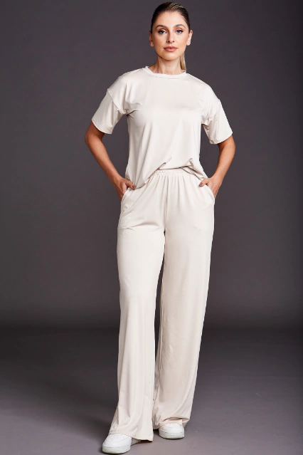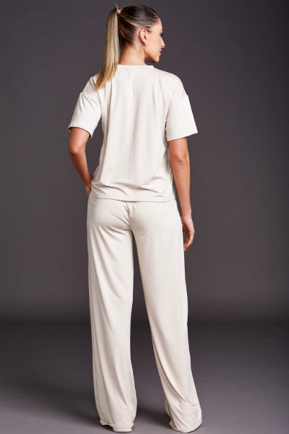 Calça cintura alta com elástico largo na cintura e dois bolsos.
