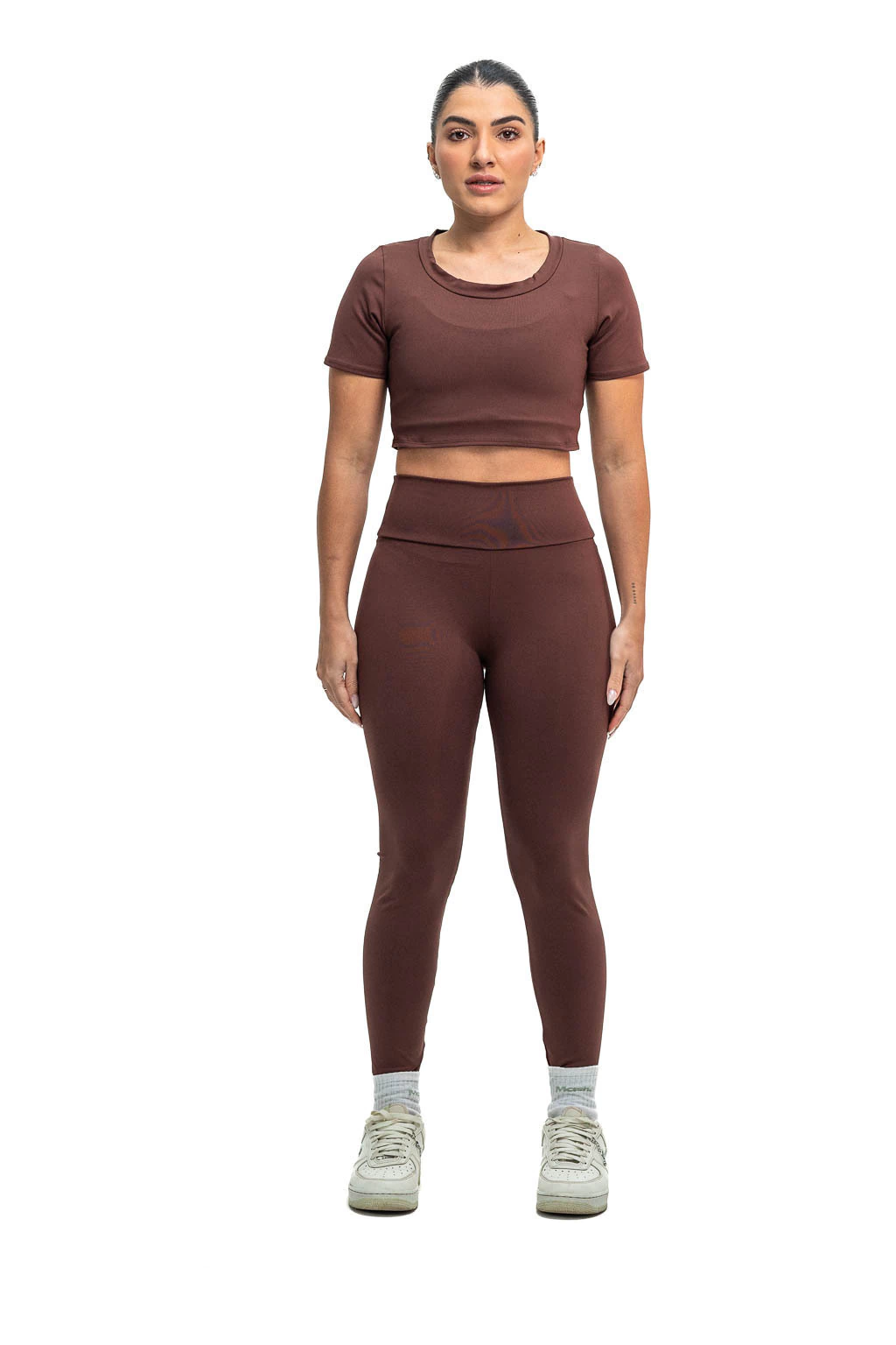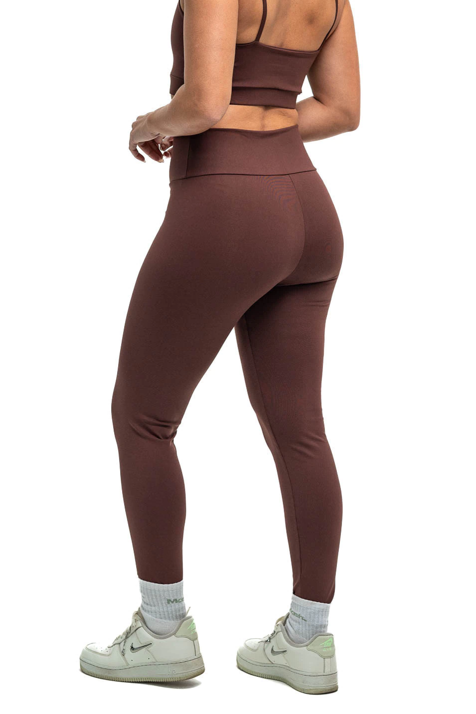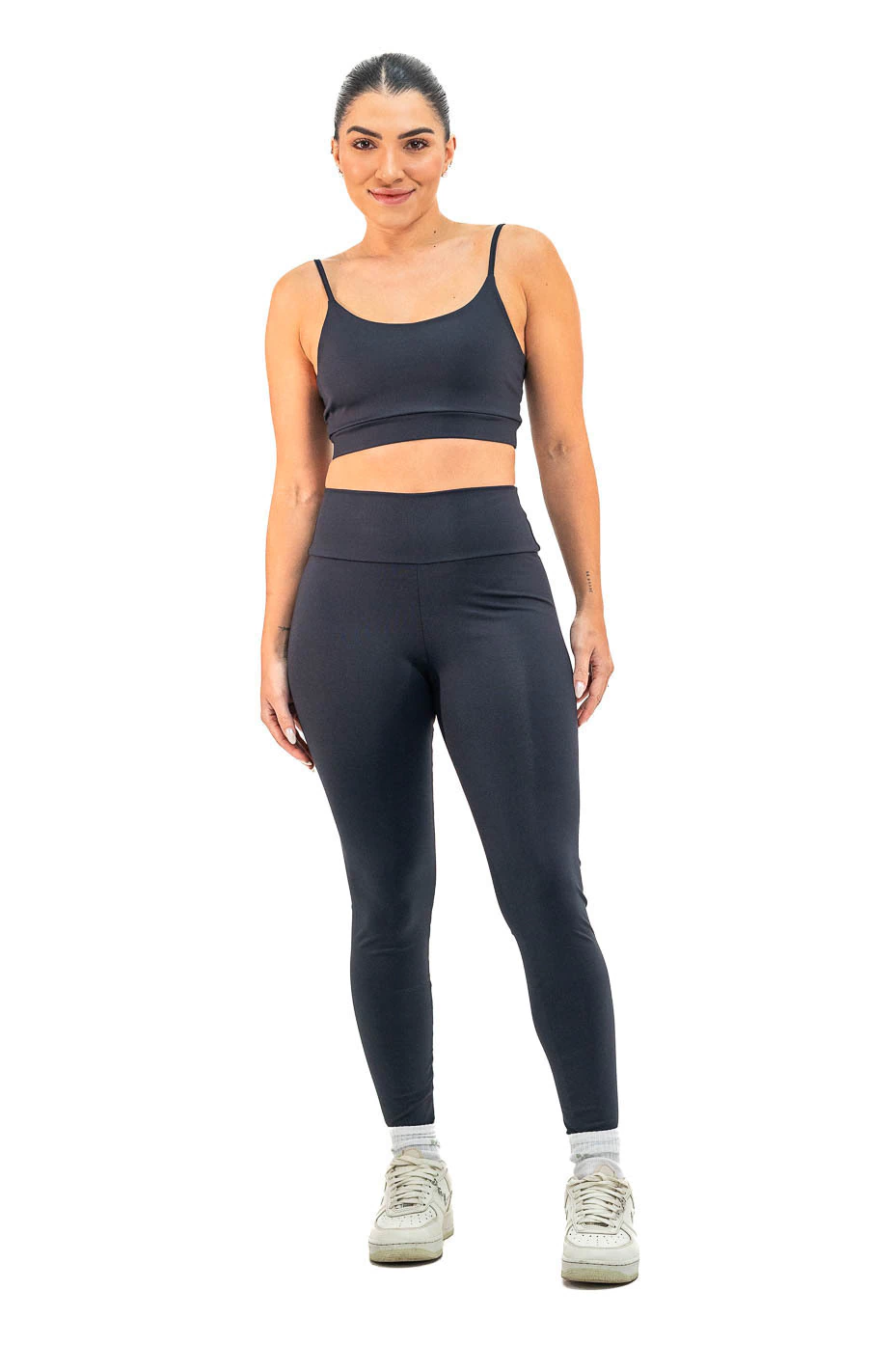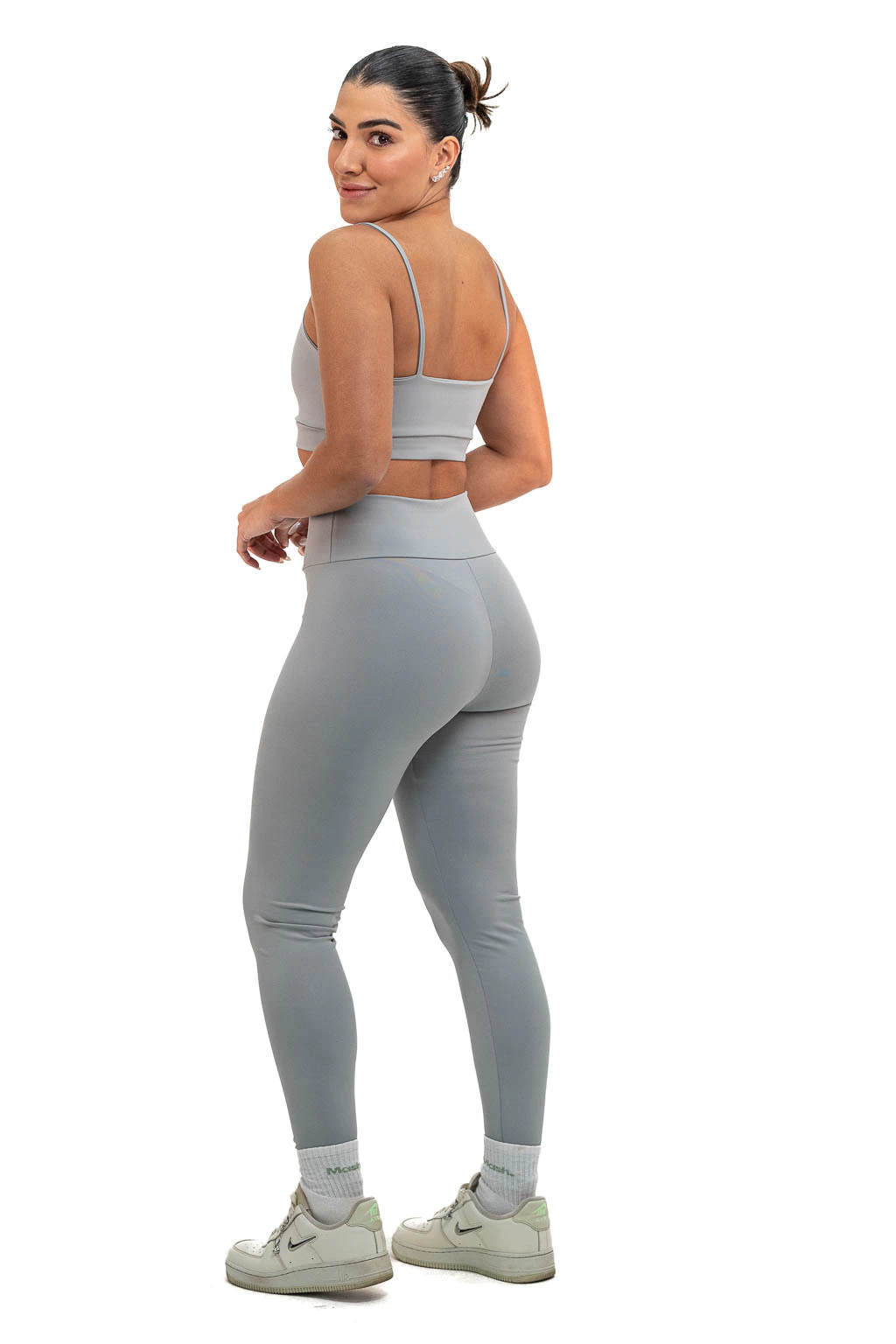 Calça com cós largo e alto, modelo justo e cintura alta.