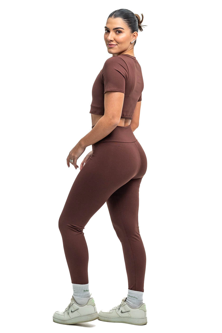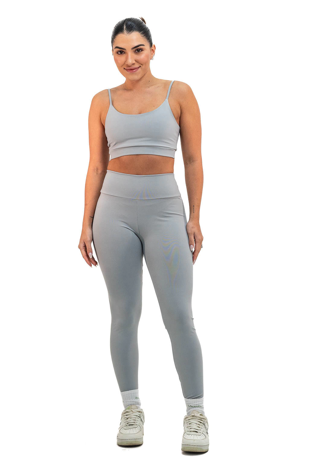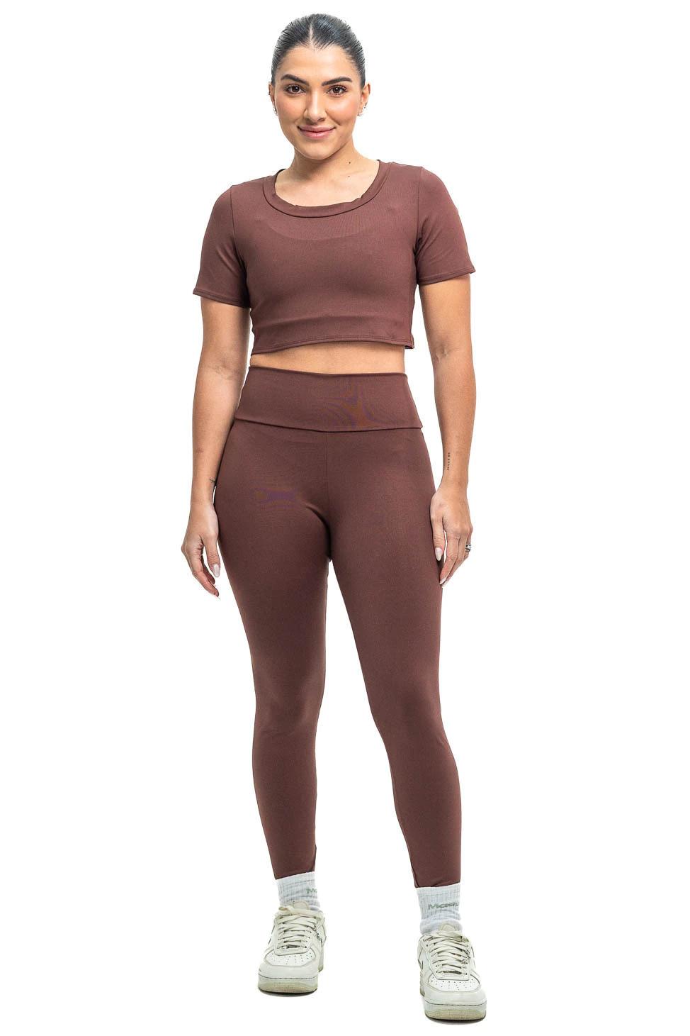 Calça com cós largo e alto, modelo justo e cintura alta.