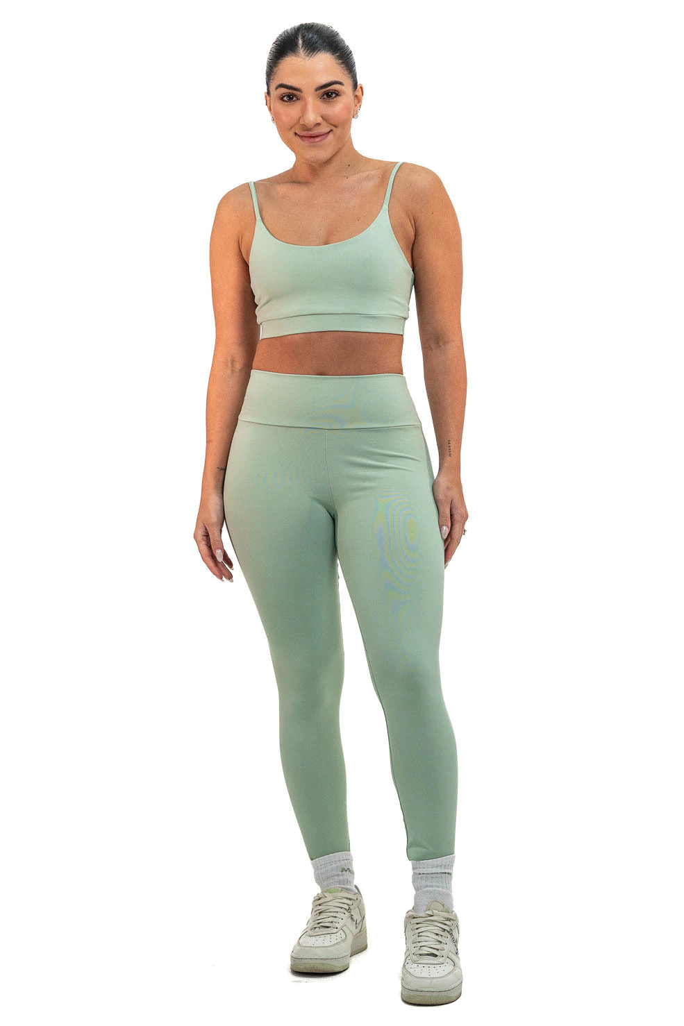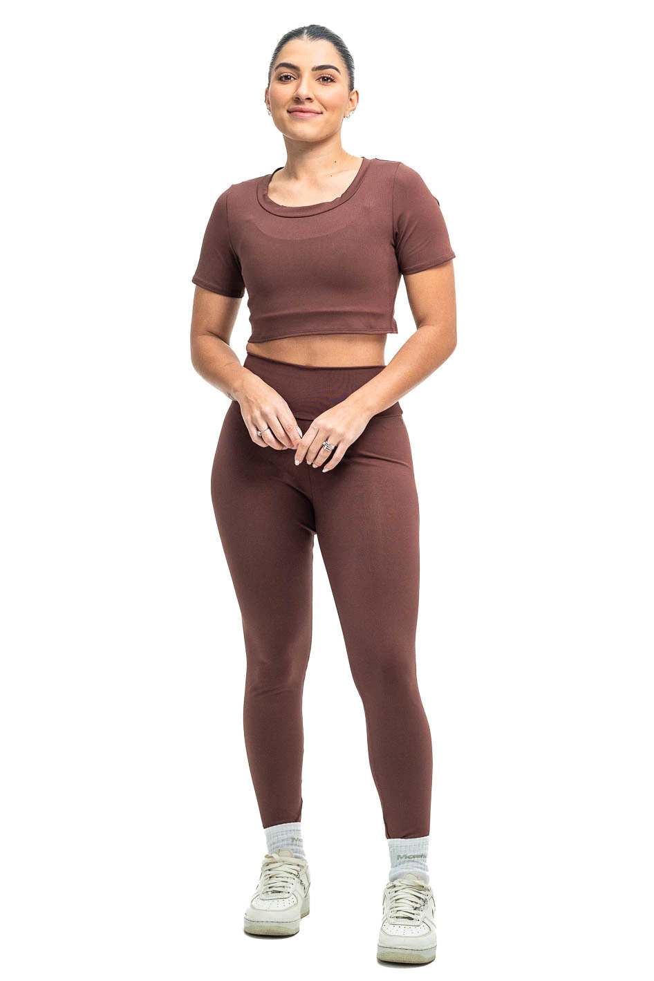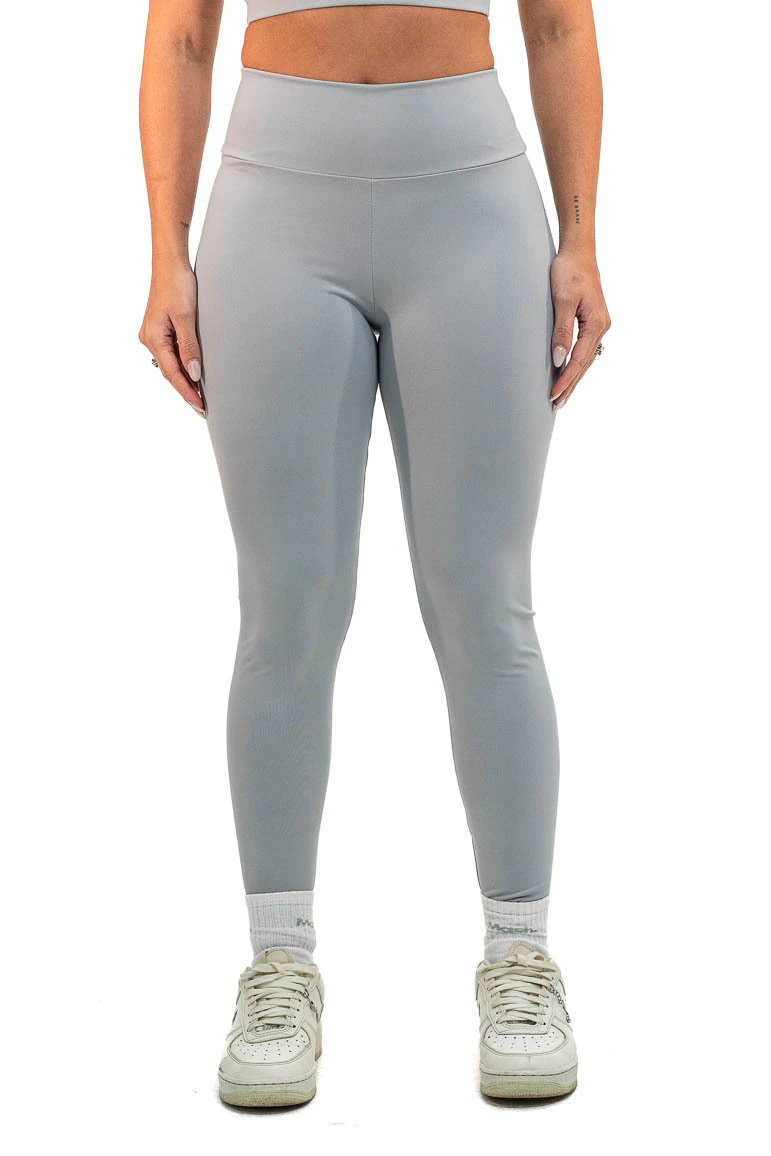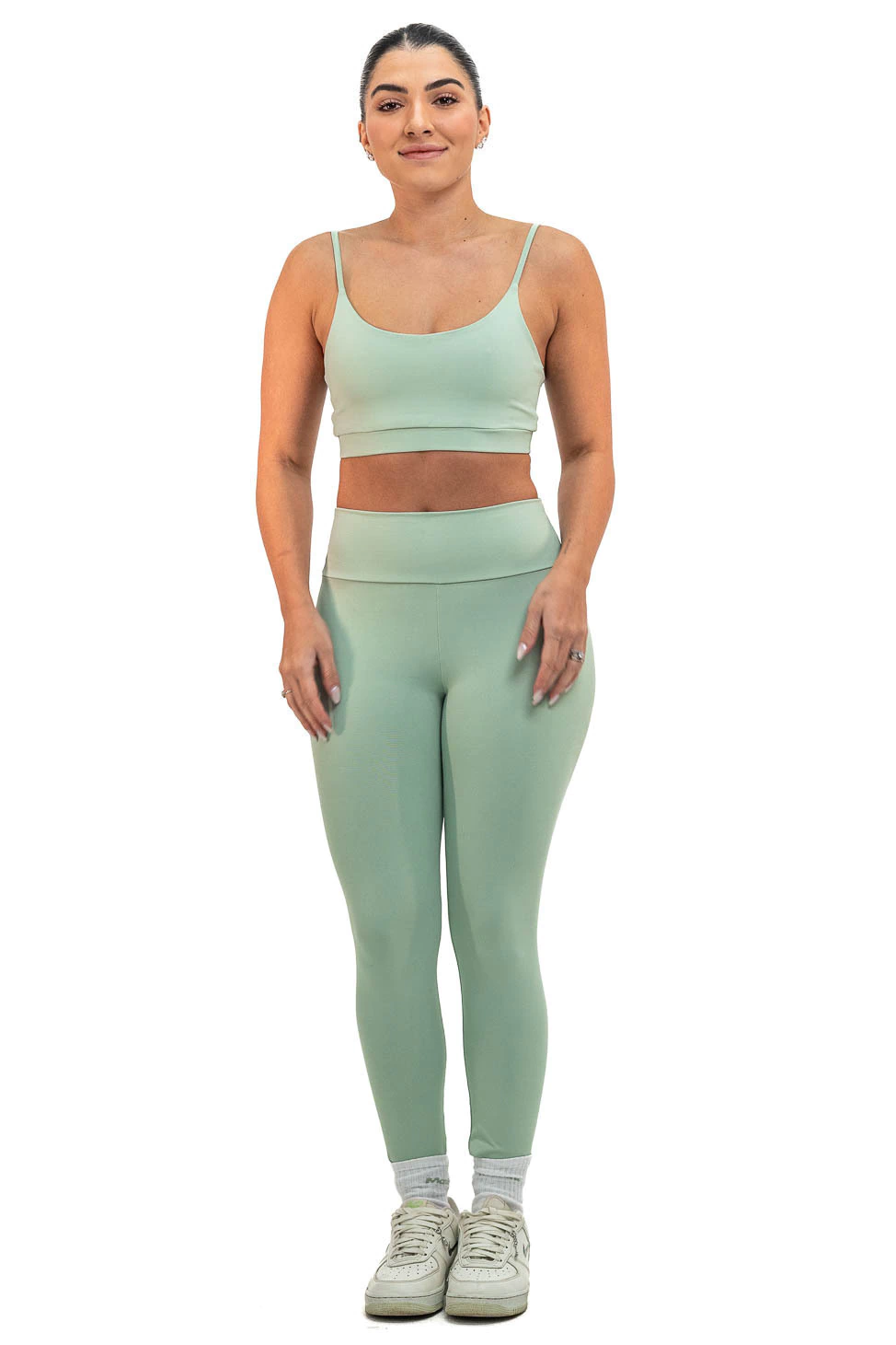 Calça com cós largo e alto, modelo justo e cintura alta.