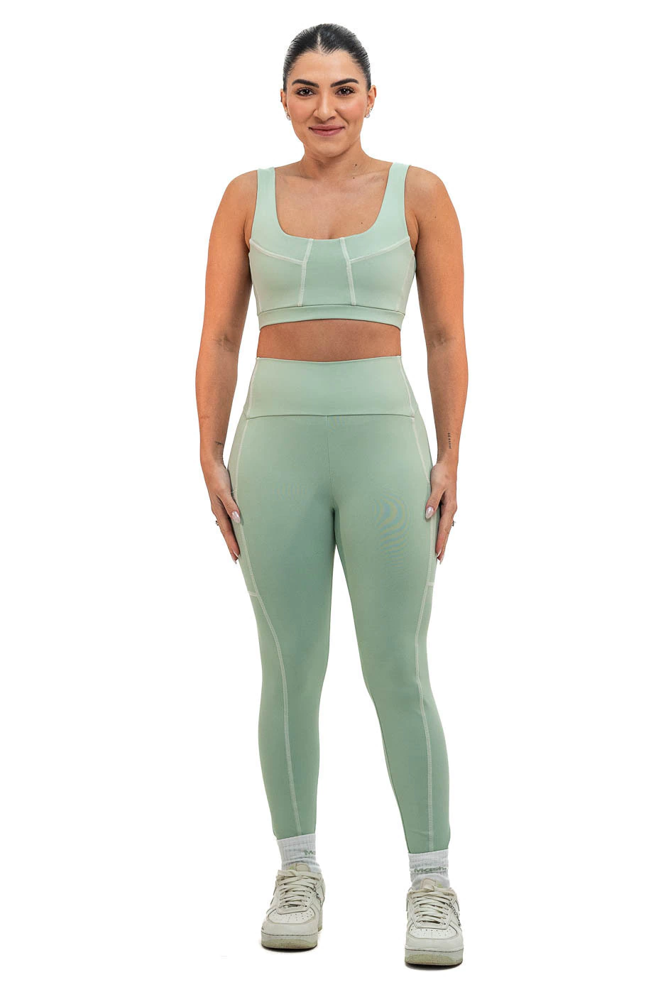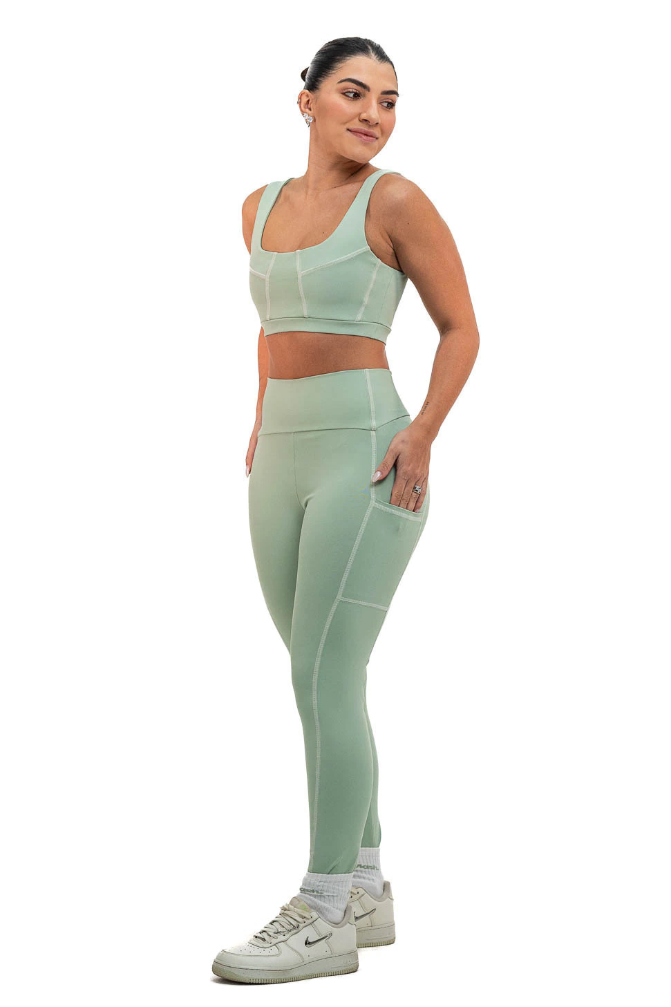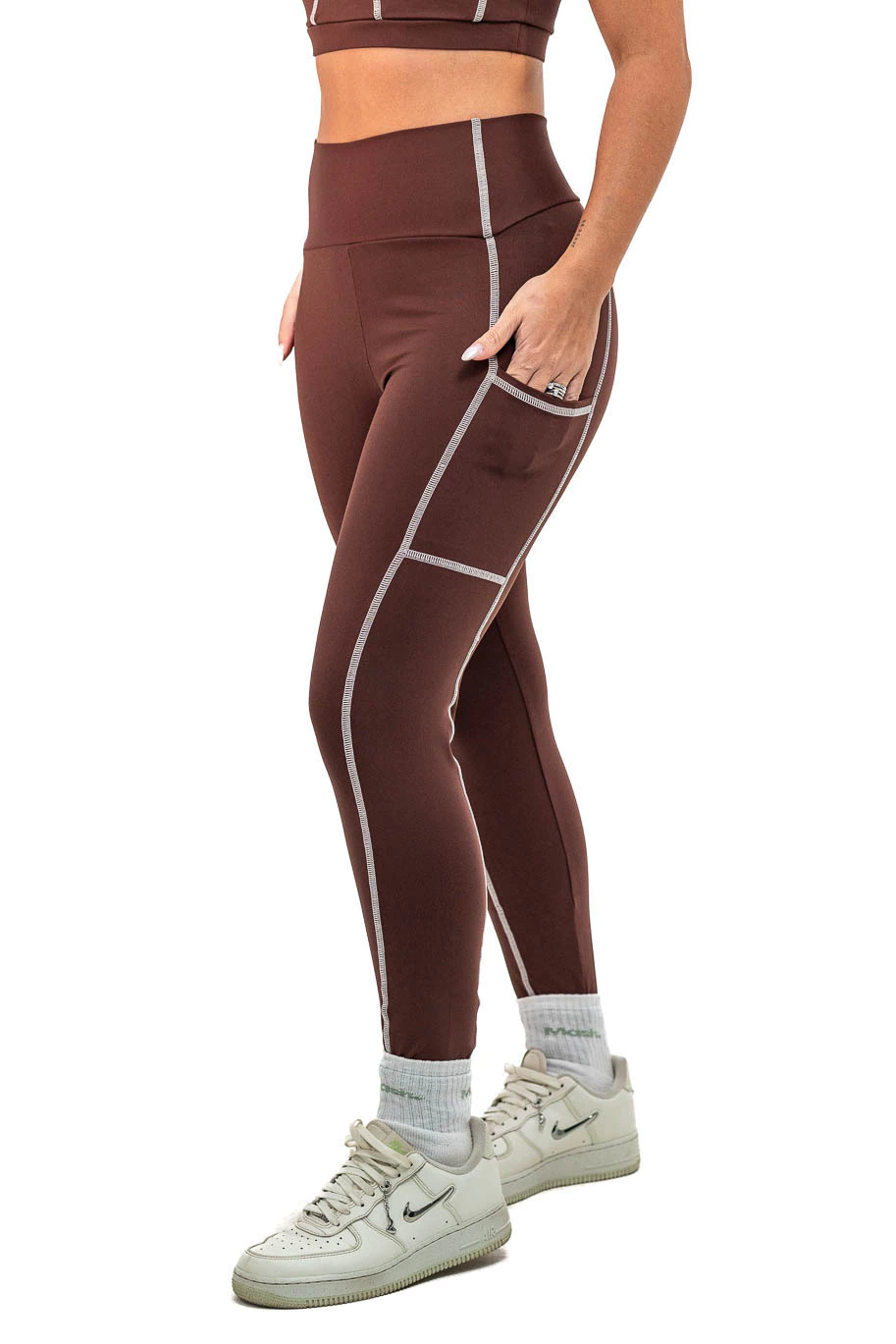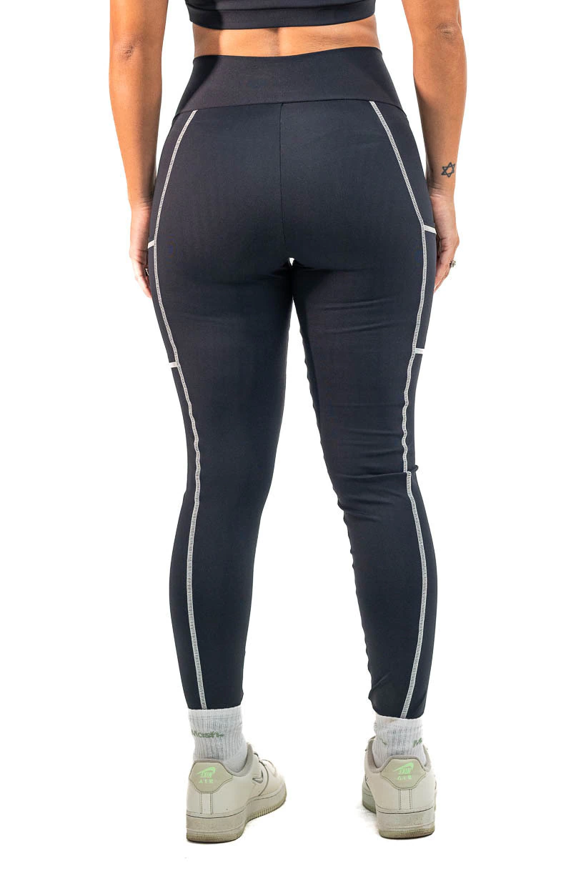 Costura sobreposta nos recortes e com bolso na lateral para colocar celular, cartão e etc.