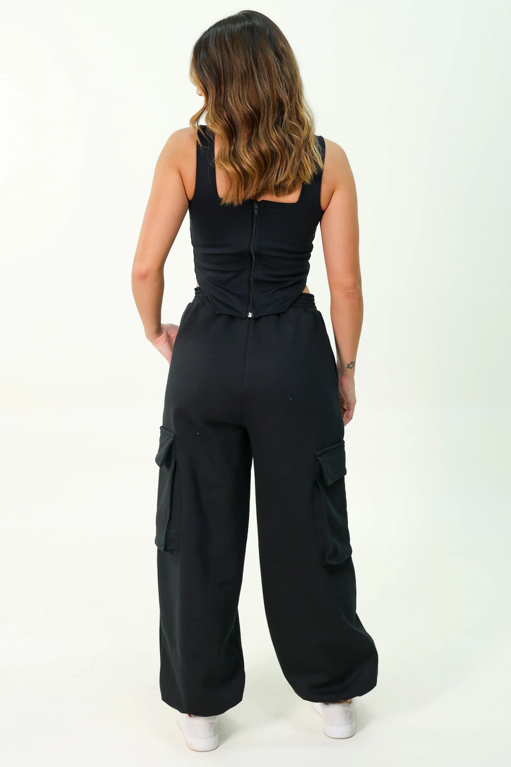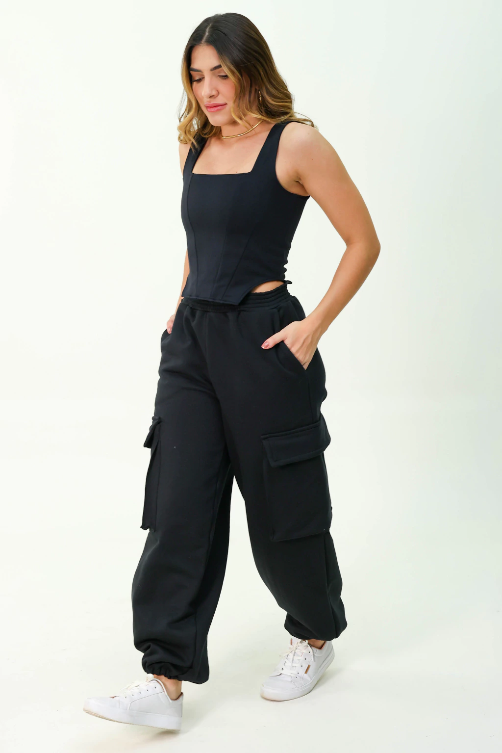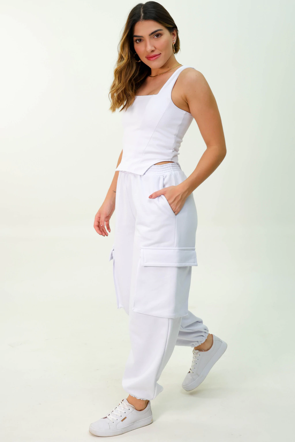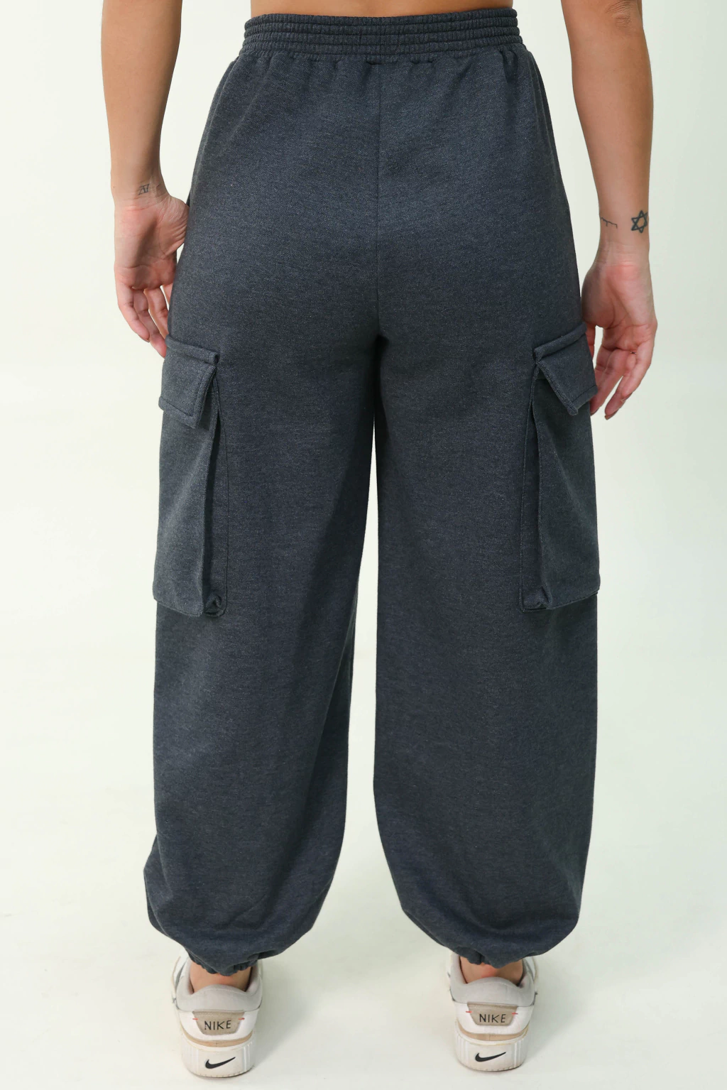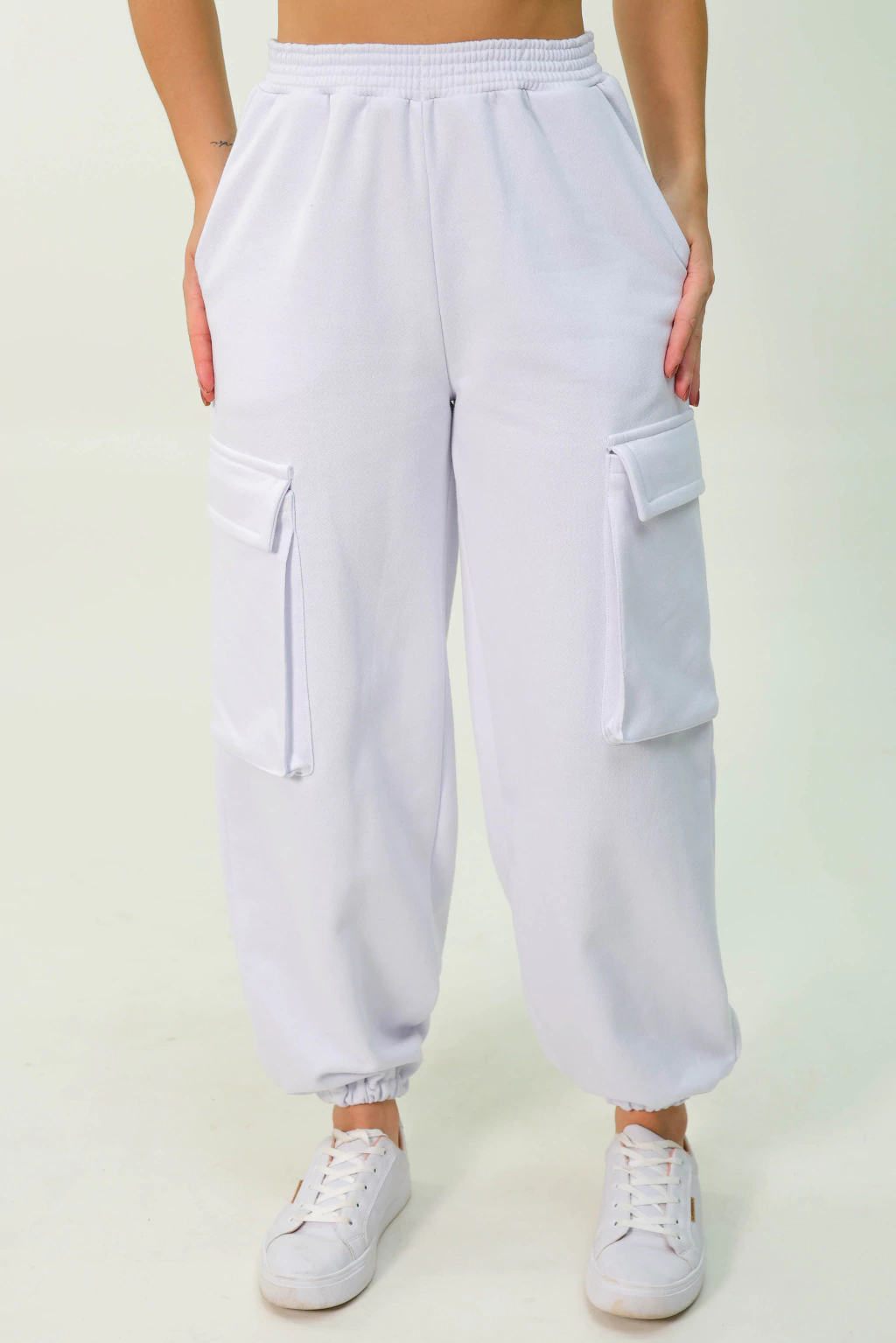 Calça de moletom no estilo cargo cintura alta com cós de elástico e bolsos.