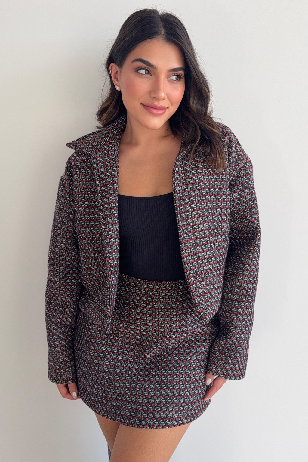 Casaco de tweed 100% forrado, estilo oversized no comprimento da cintura, com gola.