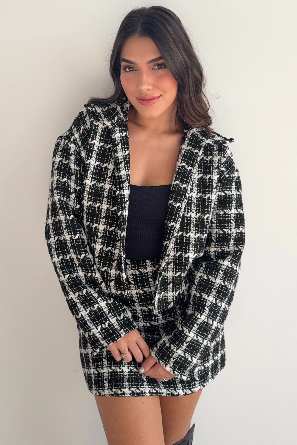 Casaco de tweed 100% forrado, estilo oversized no comprimento da cintura, com gola.