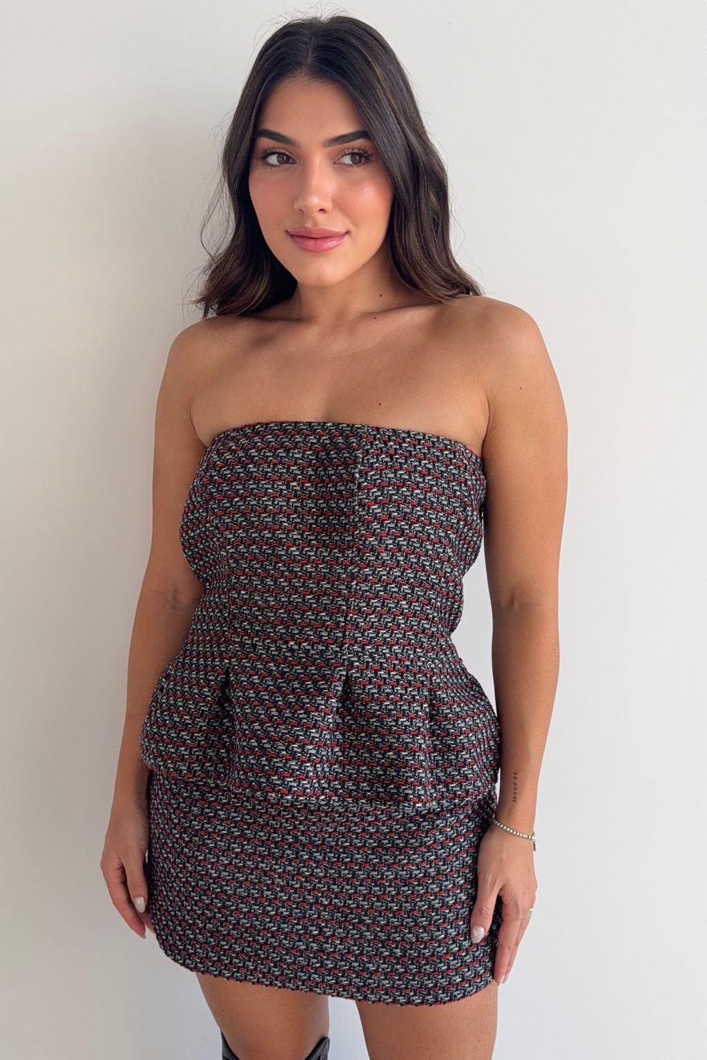 Corset de tweed tomara que caia 100% forrado e bem estruturado. Modelo com pouca elasticidade, zíper nas costas e babado levemente godê aplicado na área da cintura.