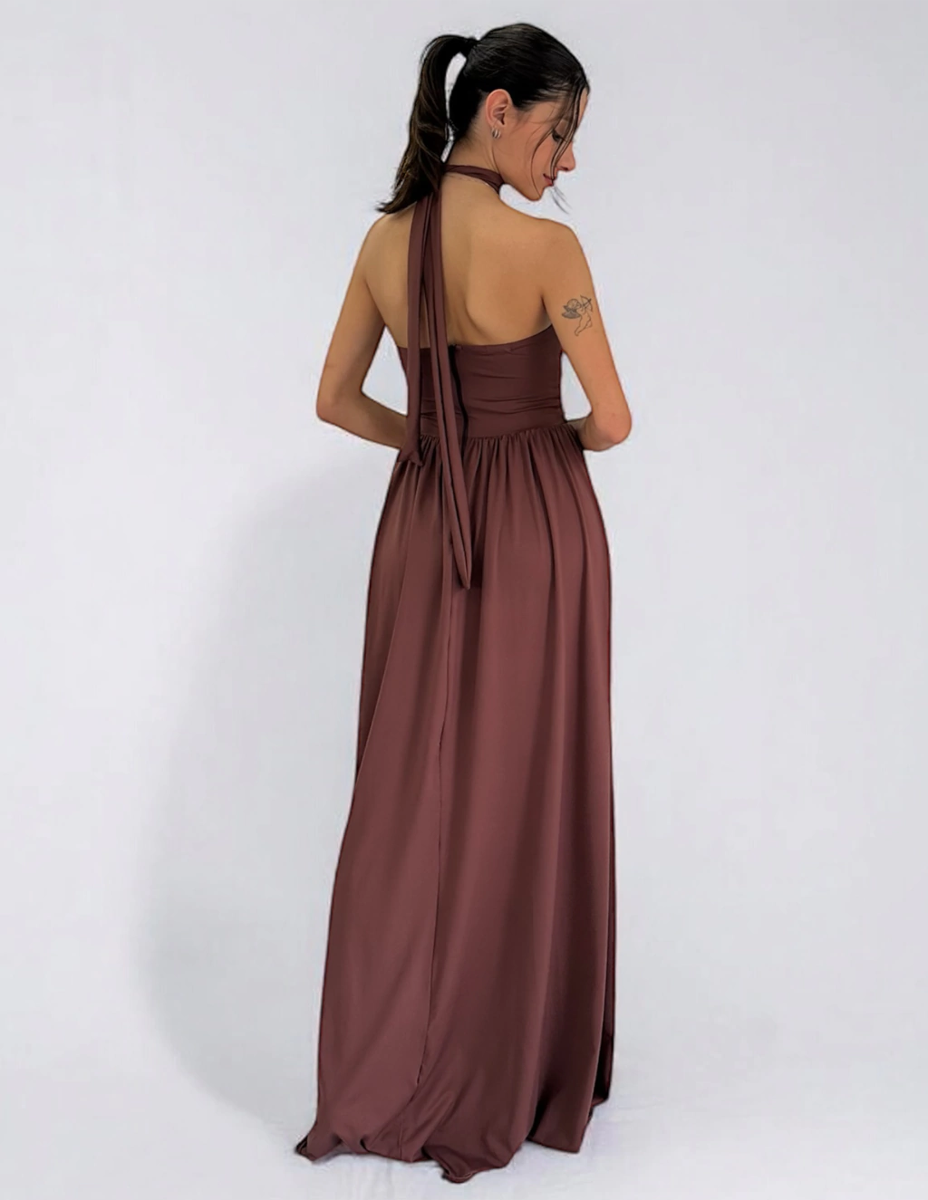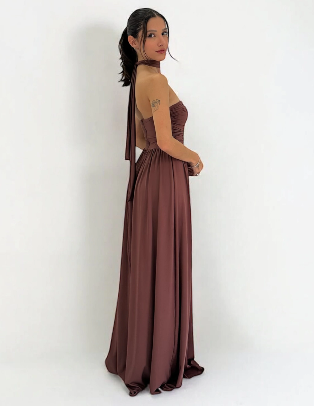 Vestido tomara que caia com a parte de cima inteira drapeada e cintura com saia franzida, costas com elástico e zíper no meio. Amarração no pescoço a parte, você pode usar com ela ou sem, ou colocá-la como um cinto, na cintura.